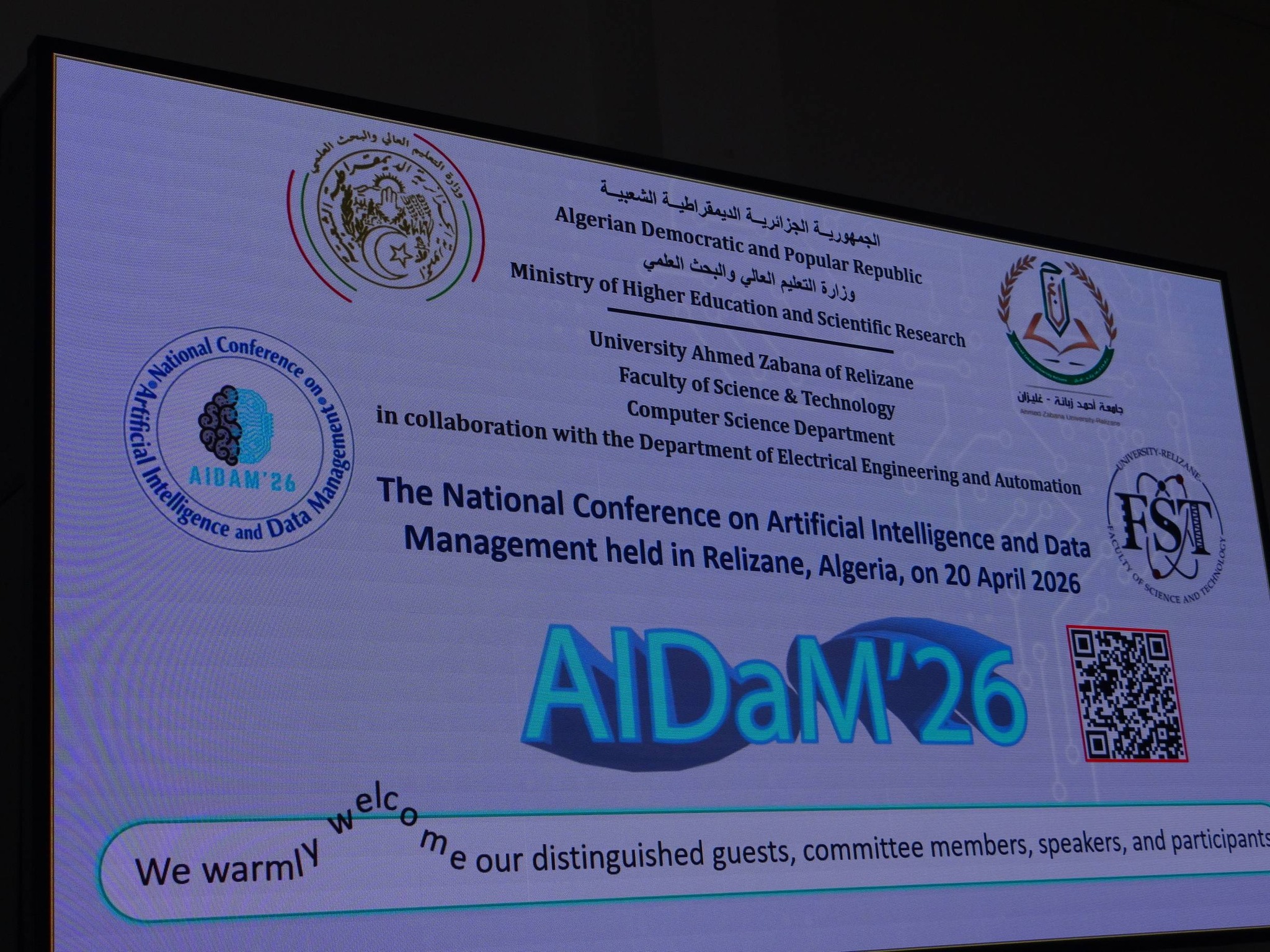 في أجواء علمية متميزة اشرف السيد مدير الجامعة البروفيسور طيب جعغري صباح اليوم الإثنين 20 أفريل 2026 على مراسيم الإفتتاح الرسمي لفعاليات ملتقى وطني (حضوري/عن بعد) موسوم بـ : ” 1st National Conference on Artificial Intelligence and Data Management (AIDaM’26) ” المنظم من قبل قسم الإعلام الألي بقاعة المحاضرات الكبرى المرحوم بن عيسى مصطفى بحضور :